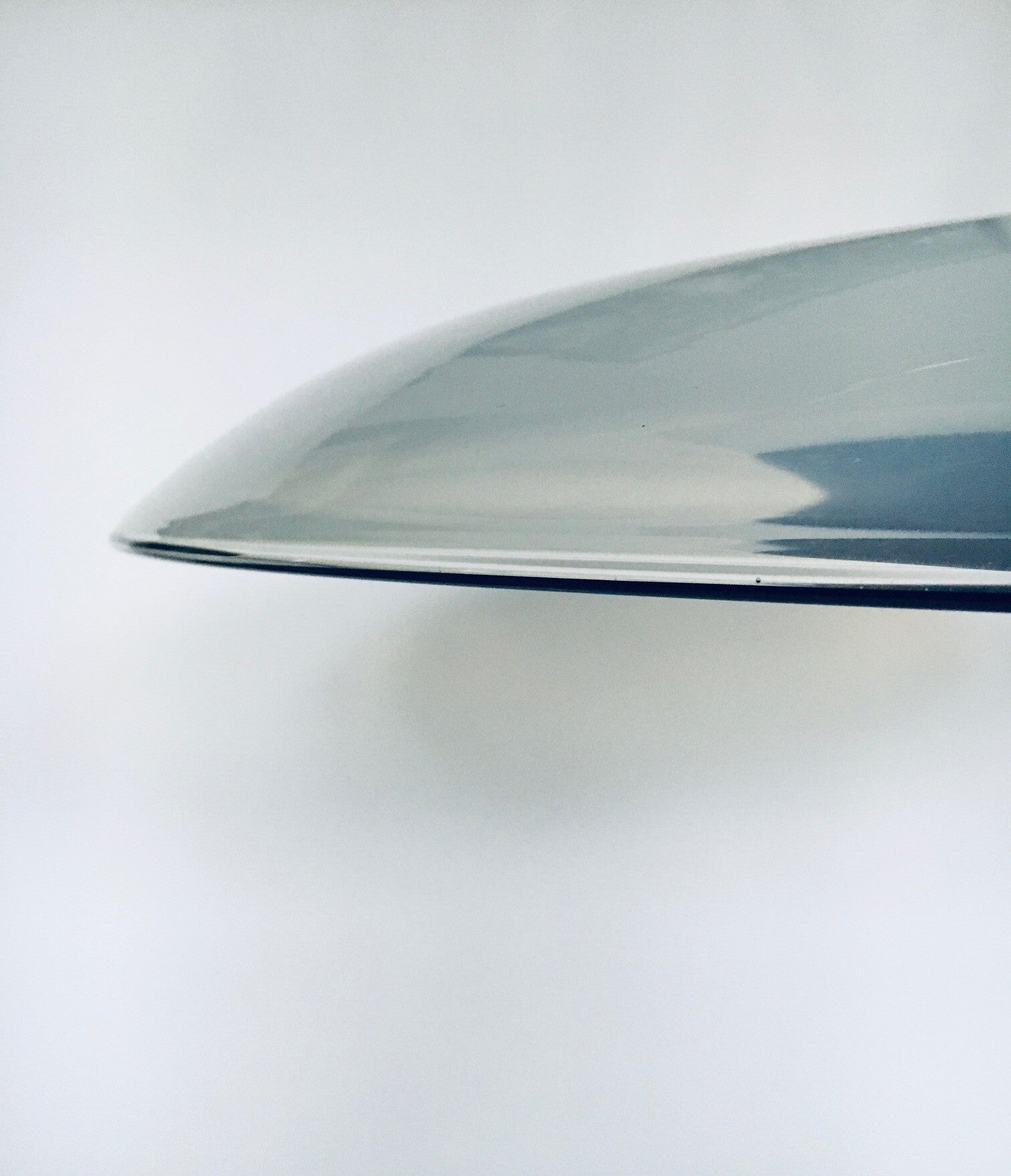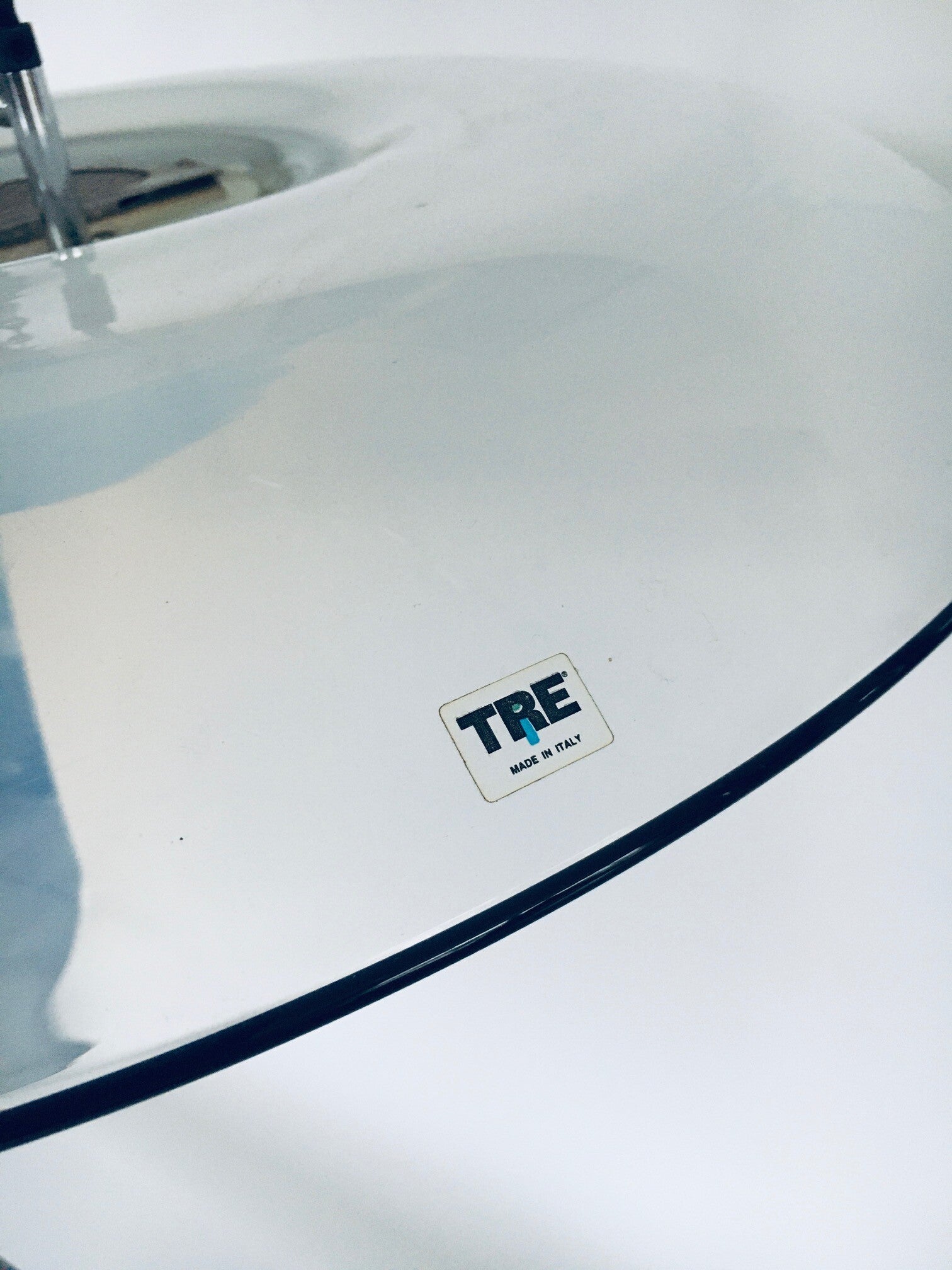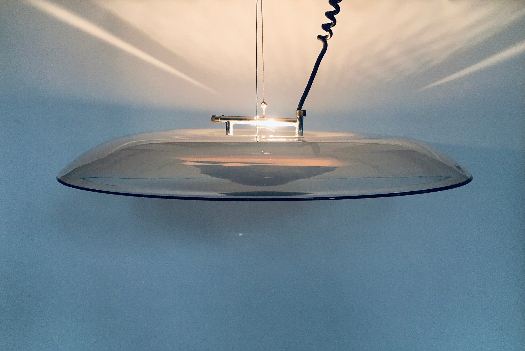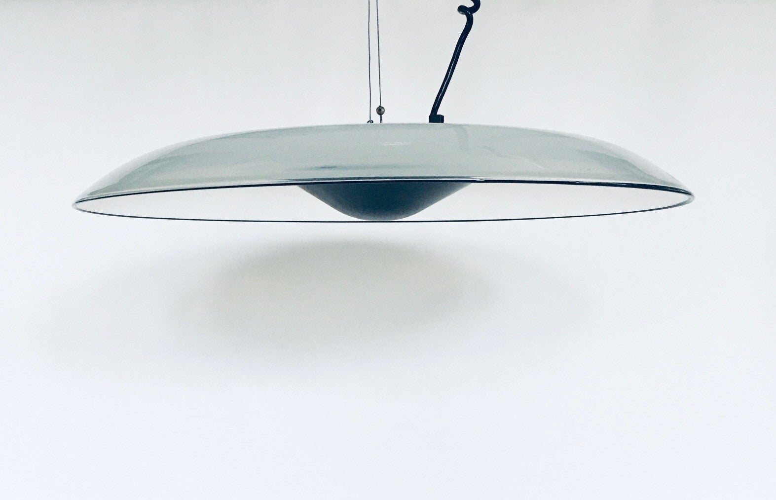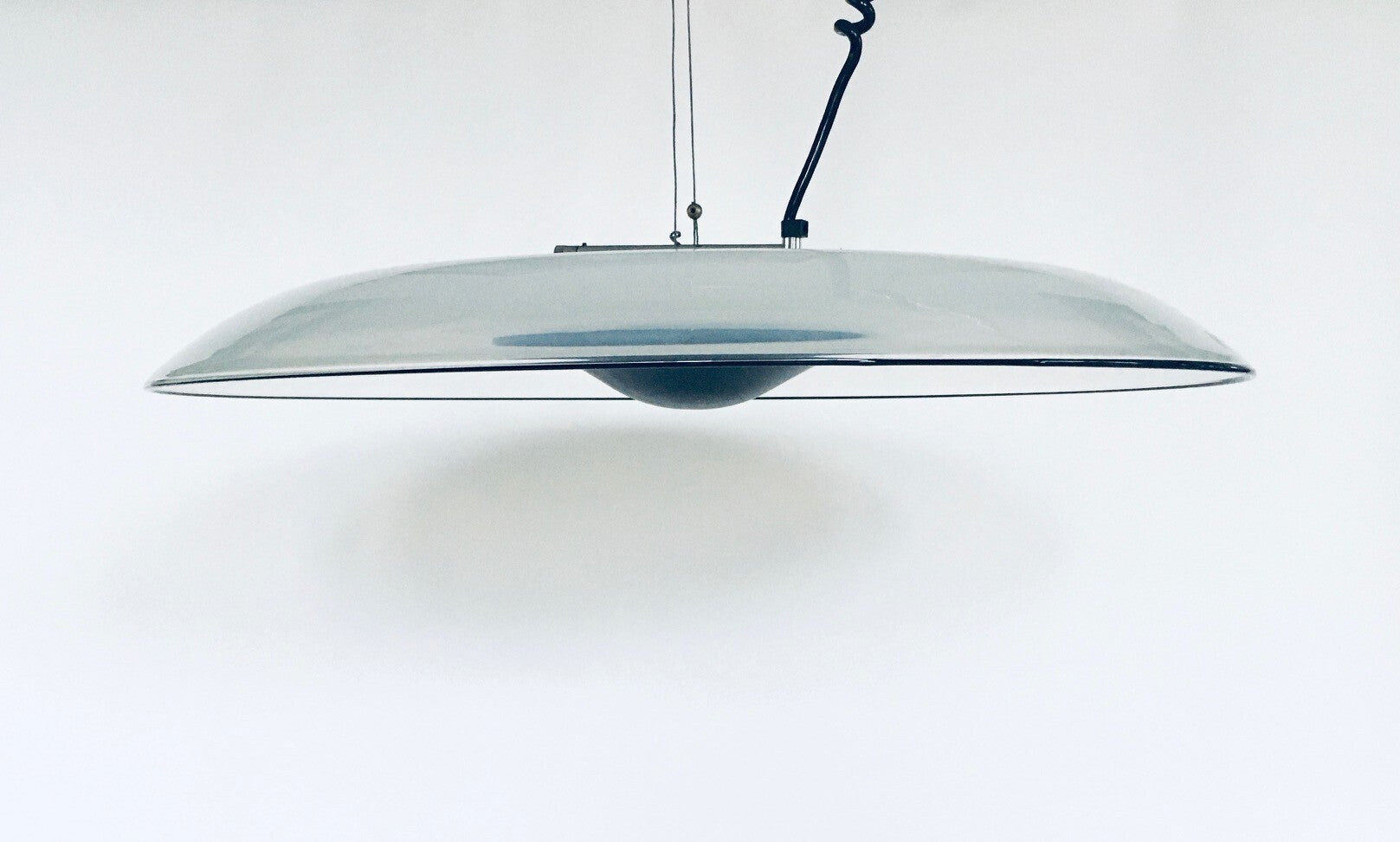 Vintage Postmodern Design XL Murano Glass Pendant Lamp by ITRE, made in Italy 1980's. Itre Gabbiano, design by Mauro Marzollo. Marked with original brand label. XL smoke glass with black trim disc with black disk on this hanging pendant lamp. All original and in very good condition. Measures 10cm x 65cm x 65cm.