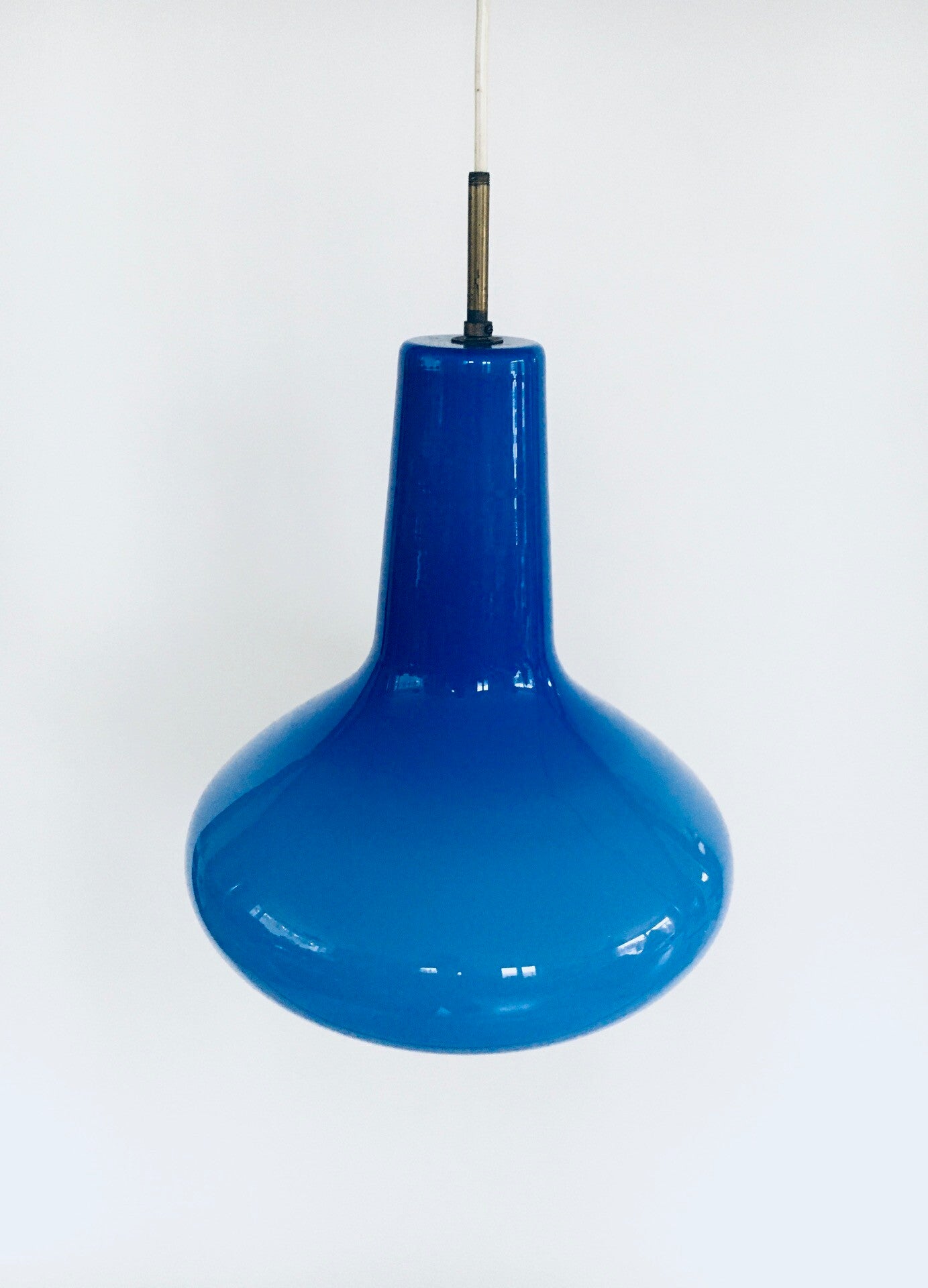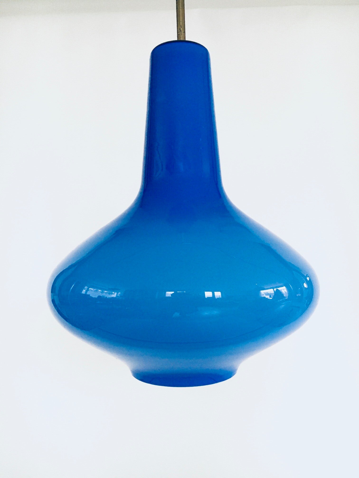 Vintage Midcentury Modern Design Blue Opaline Glass Pendant lamp designed by Massimo Vignelli for Venini, Murano, Italy 1950's. Handblown opaline Venini glass. It has a blue coloured glass with all the original parts. The wires have been checked and changed. In perfect condition. Measures 42cm x 28cm x 28cm.