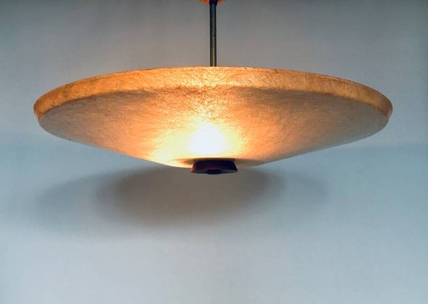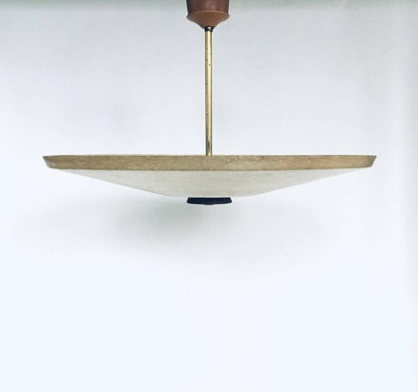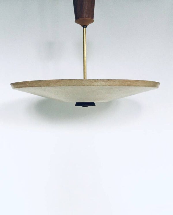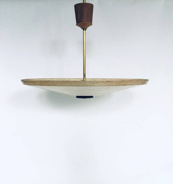Vintage Midcentury Dutch Design Pendant Lamp. Made in the Netherlands, 1950's. XL thin fiber plastic shade with teak wood ceiling cover and bottom shade holder and large brass stem. This is a rare model lamp in all original good condition. Has 3 light points, one is missing it's lamp holder (needs replacement). In good working order. Measures (including the brass stem) 70cm x 68cm x 68cm. The fiber shade measures 5cm x 68cm x 68cm.