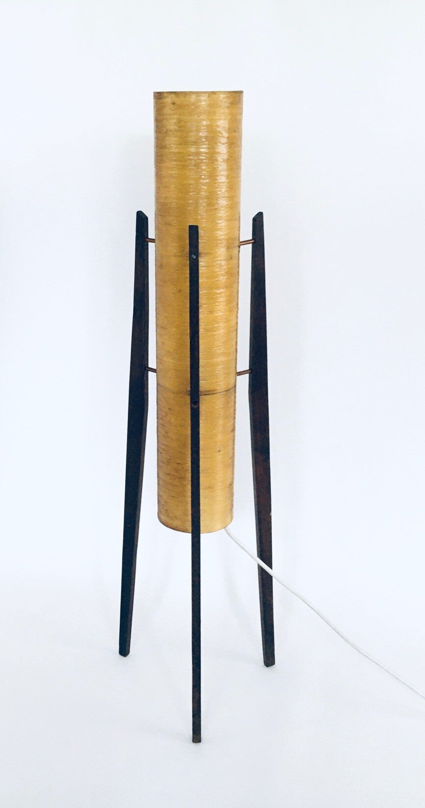 Vintage Midcentury Space Age Design ROCKET Floor Lamp by Novoplast. Made in Czechoslovakia, 1950's / 60's. Yellow fiber plastic shade with wooden tripod legs. Original condition with new wire and plug. Measures 116cm x 32cm x 32cm.