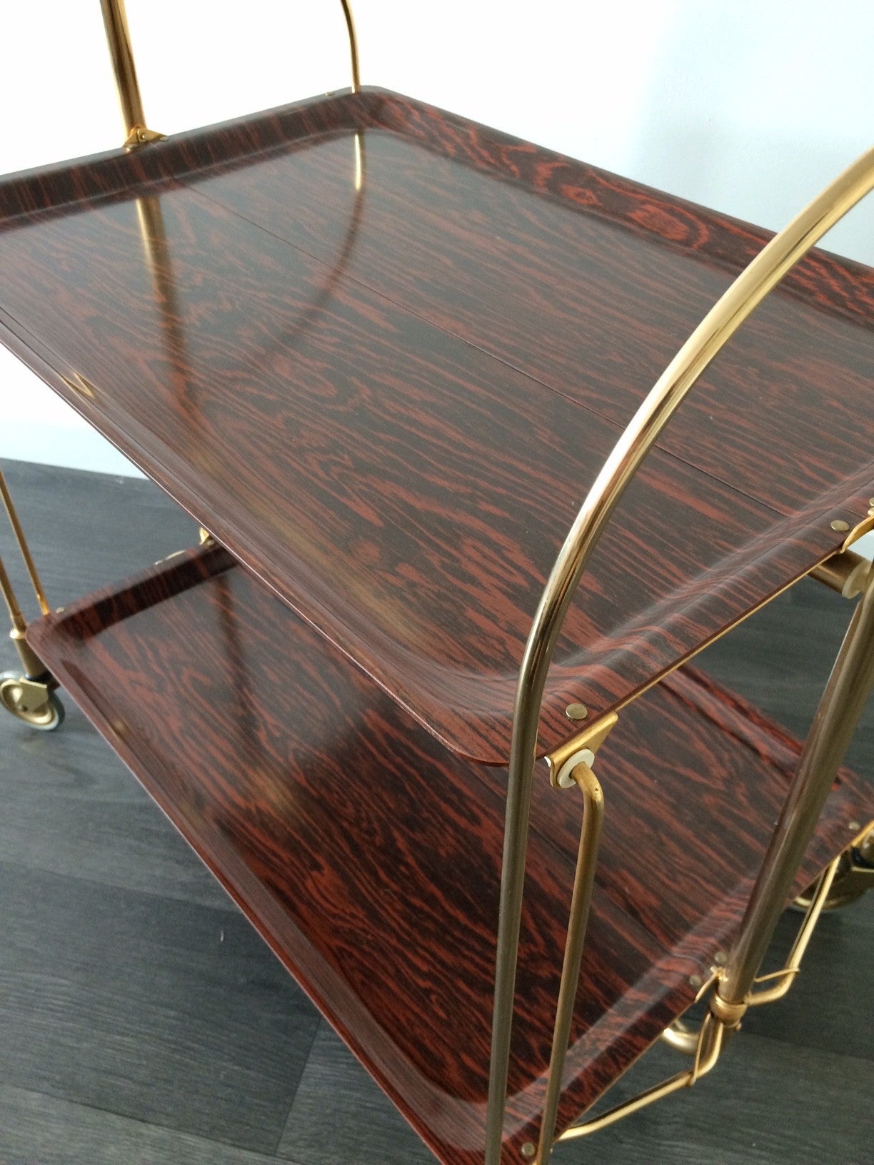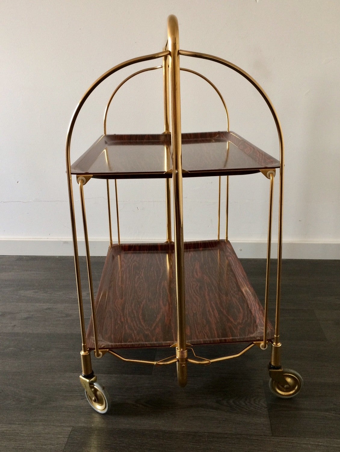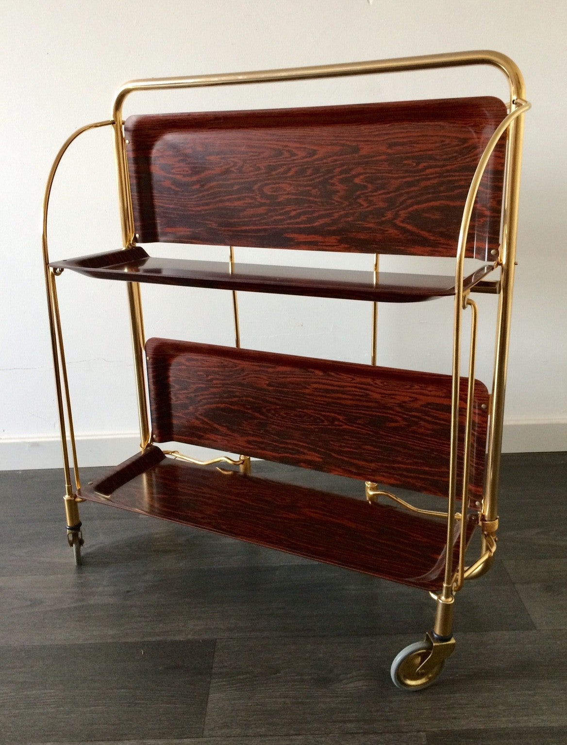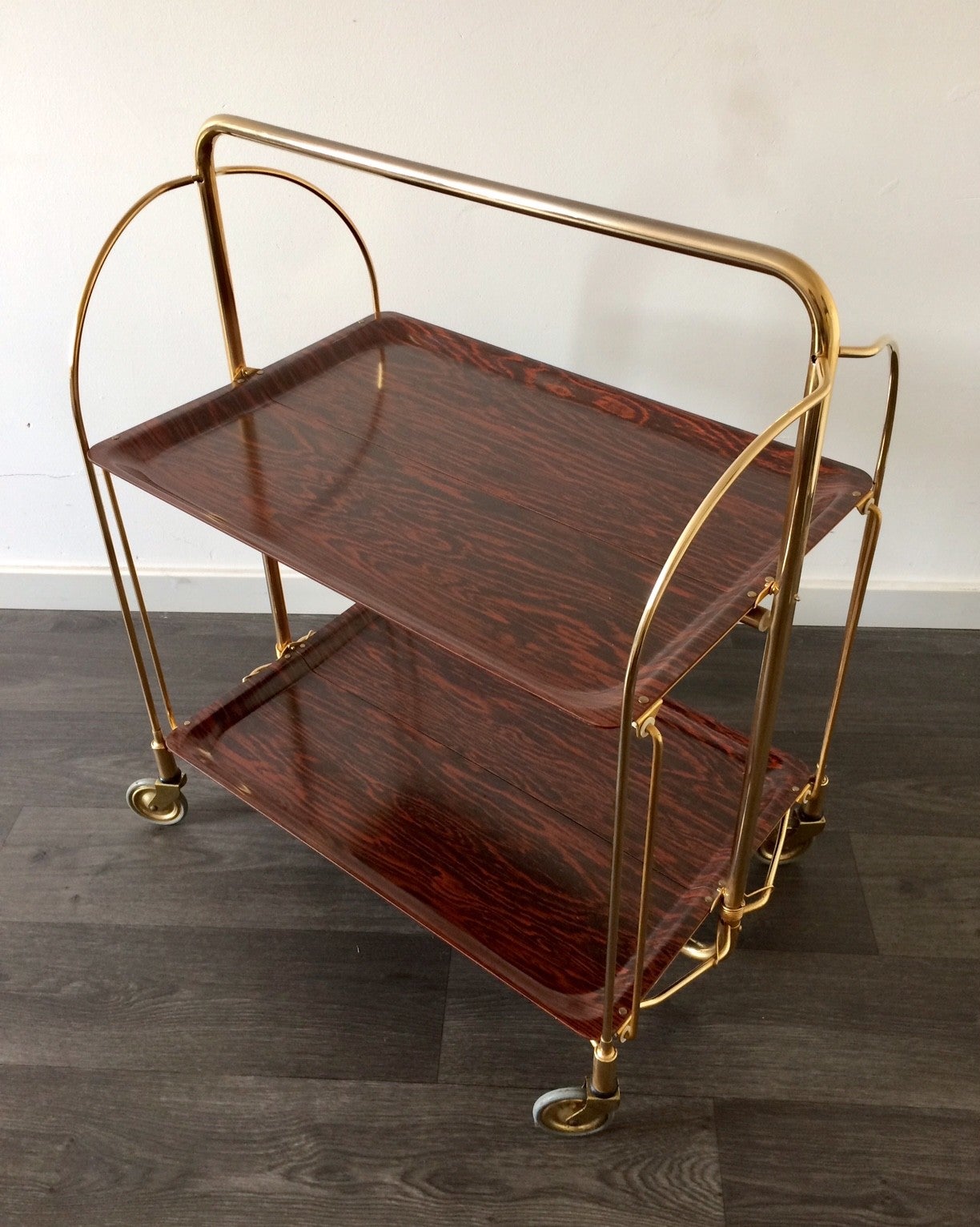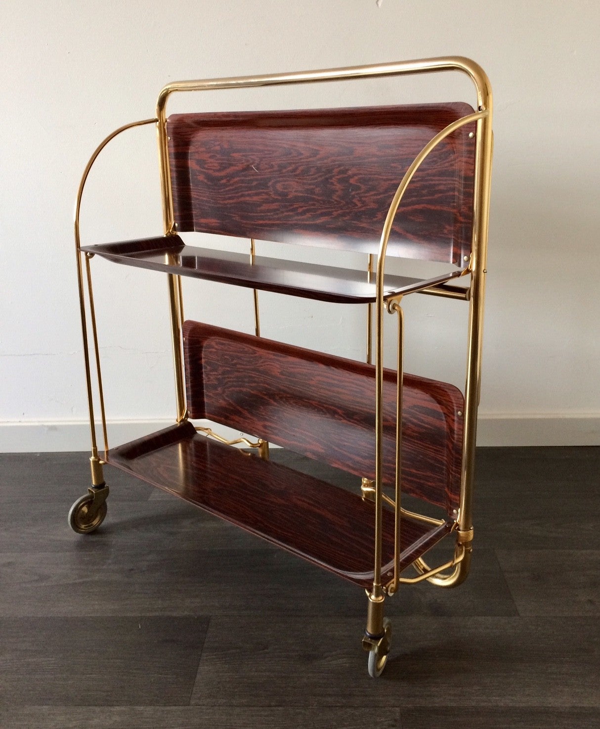 A vintage 1960's Bremshey & Co Gerlinol design DINETT Serving Trolley. Foldable trolley with wheels. Brass and plastic with wood print. In very good condition. 78cm x 65cm x 41,5cm.