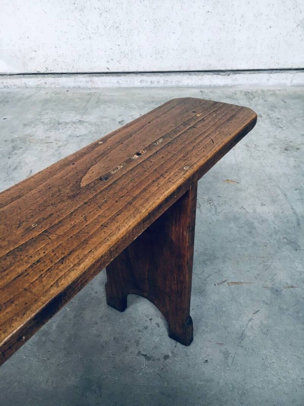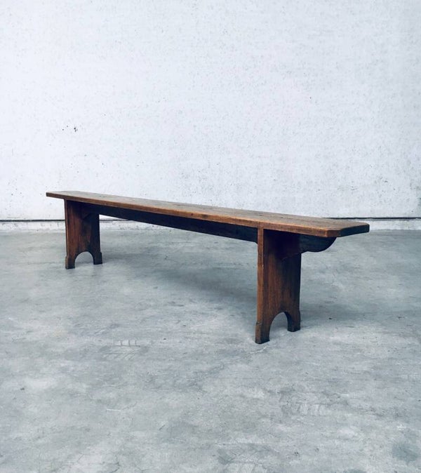 Vintage Rustic French Design Solid Oak side bench or monastry dining table bench. Made in France, 1930's / 40's. Solid oak constructed narrow bench with 2 legs in classic monastry form. Beautiful in it's silmplicity. In very good, all original solid condition. Patinated through time and it's use. Measures 48cm x 240cm x 22,5cm.