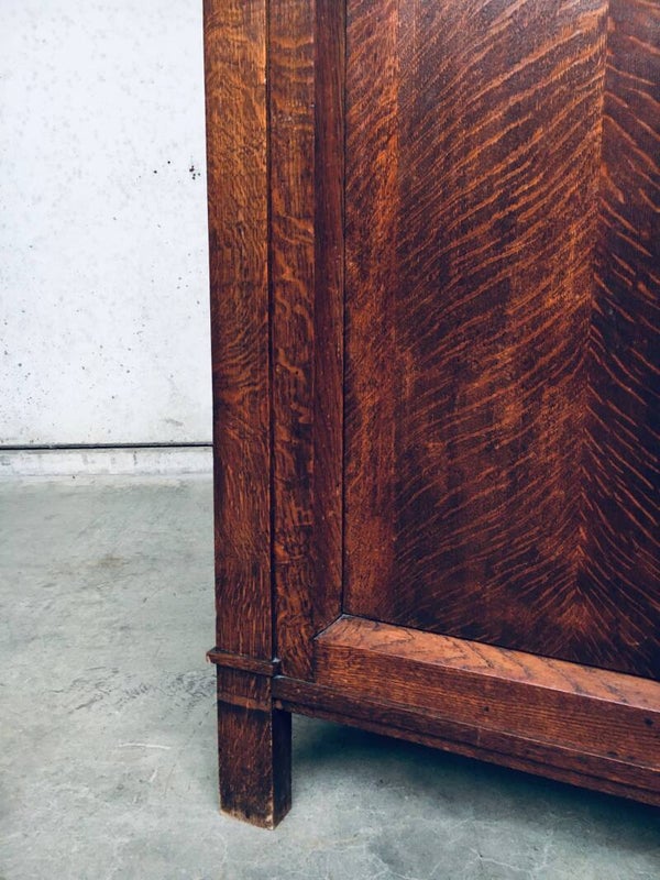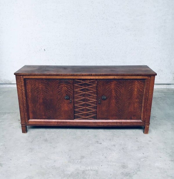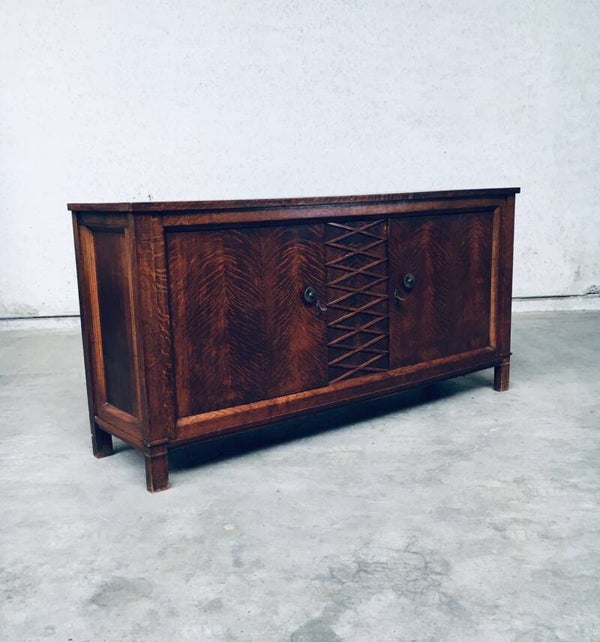 Vintage Arts & Crafts Mission Style Design Craftsman Sideboard Credenza Buffet Chest, made in France early 1900's - 1920's. Oak wood constructed buffet with blonde oak wood drawers inside. The front has a patterned striped motif set on the wood panels to look like a different higher quality wood. Has 2 doors with middle string pattern panel and round intricate brass metal handles, brass keyholes and working keys. No damage other than wear and light scratches from it's age and use. The inside has stains and marks from it's use. This measures 97,5cm x 199cm x 52cm.