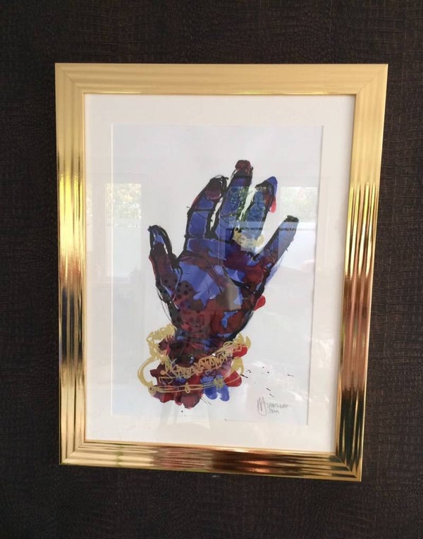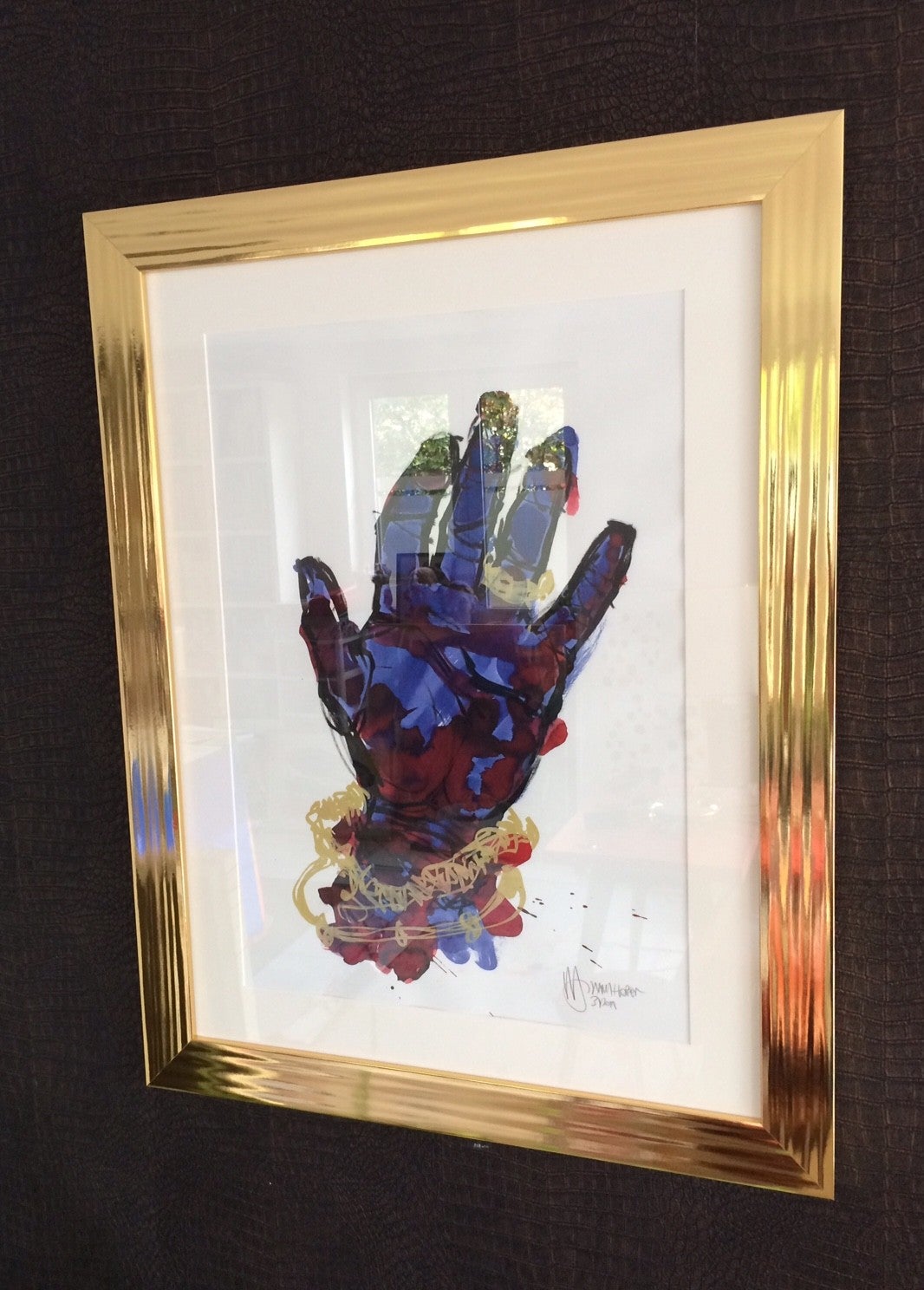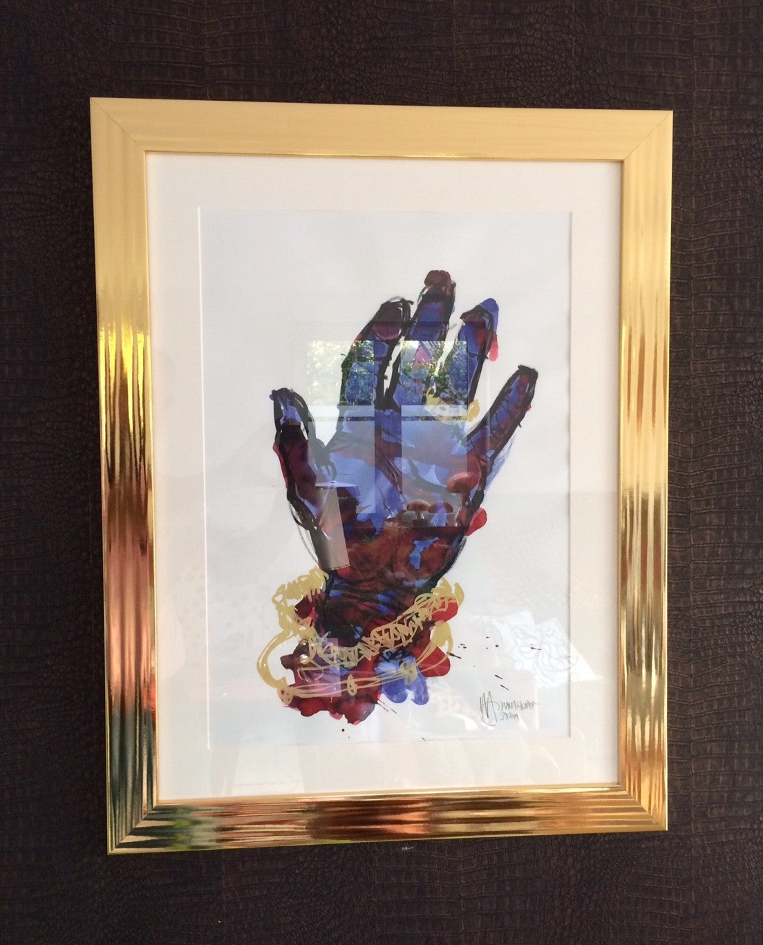 All original Art Work "BLUE BLING" by Hans Hobert HHArt, signed 3/2018. Frame size: 61,5cm x 80cm. Mixed media on paper.