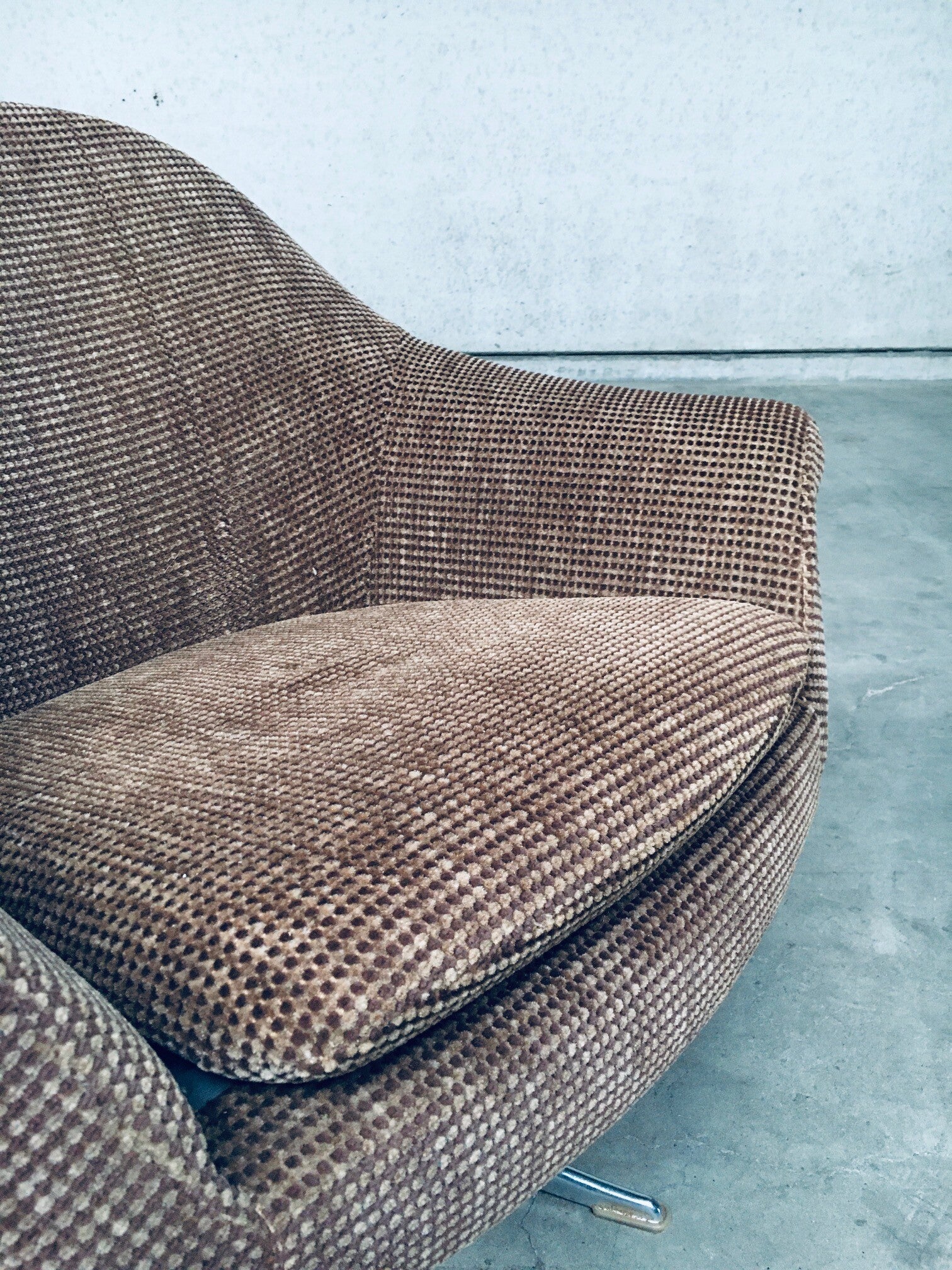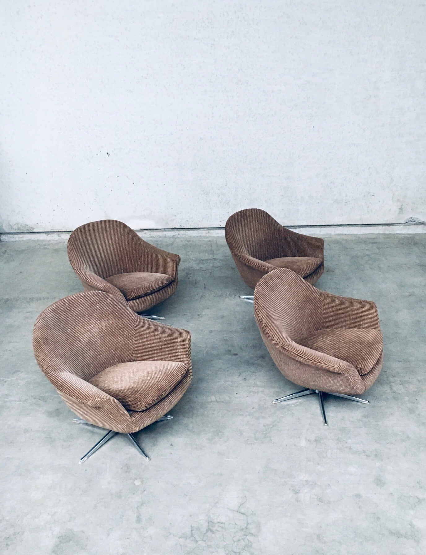 Vintage Midcentury Modern Scandinavian Design Space Age Swivel EGG Lounge Chair set of 4. Made in the 1970's. In the style of Overman, Sweden. Pod model on swivel base. Brown fabric on chrome feet. All 4 are in good overall original condition. They all have signs of their age and use. Foam formed pods are all sturdy. Some blemishes on fabric, and underneath the seat cushion, the protective fabric has come loose, or is missing, disintegrated. Each chair measures 75cm x 82cm x 75cm.