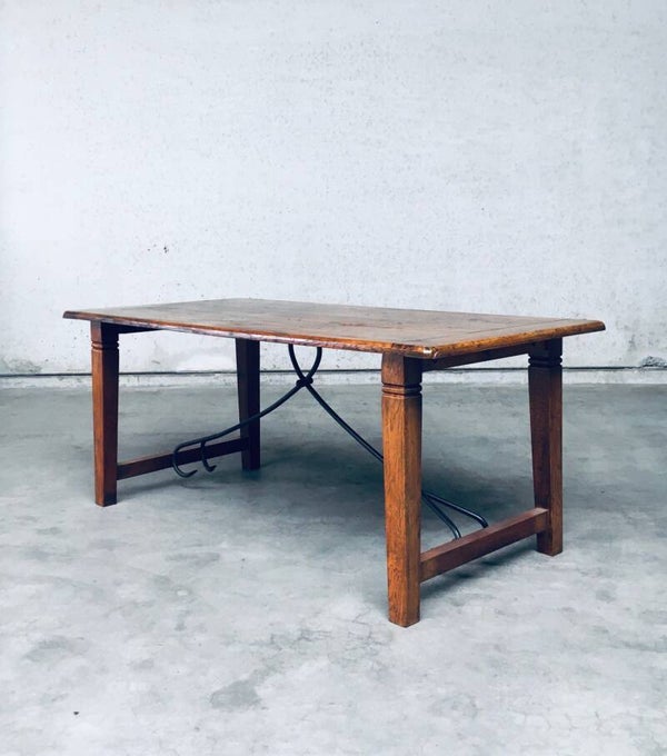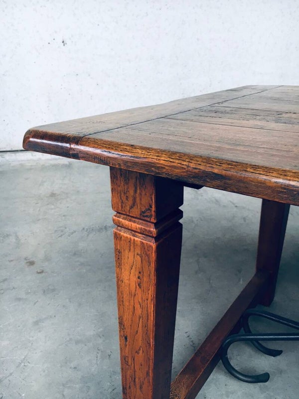 Vintage French Rustic Farmhouse Trestle Solid Oak & Wrought Iron Dining Table in Arts & Crafts Style. Made in France, 1960's. All oak constructed table with wrought iron centre support. Beautiful patinated table top. This comes in very good, sturdy condition. The table has 1 water mark stain on the top (see pictures). Measures 78cm x 188cm x 90cm.