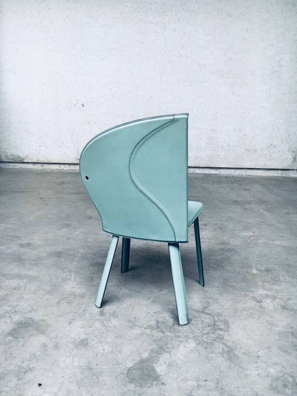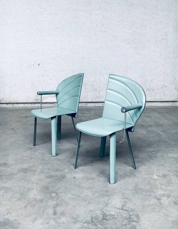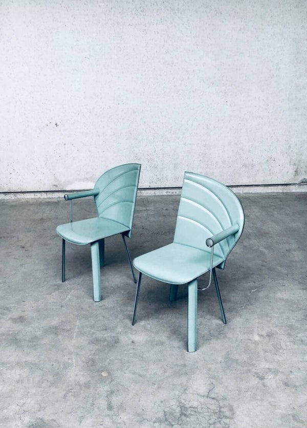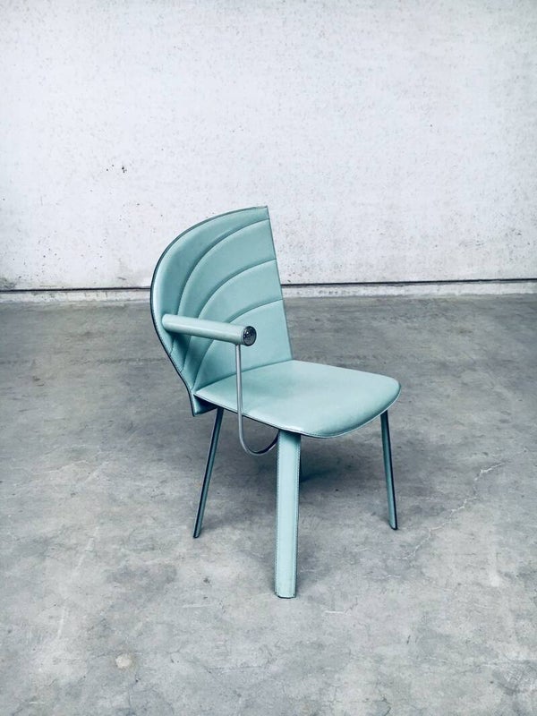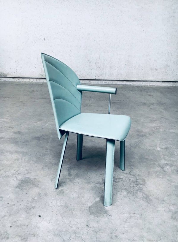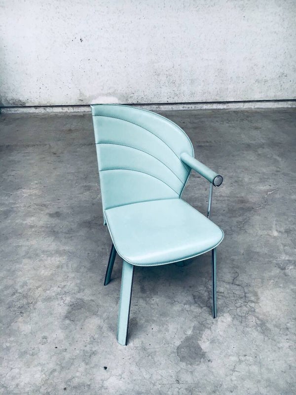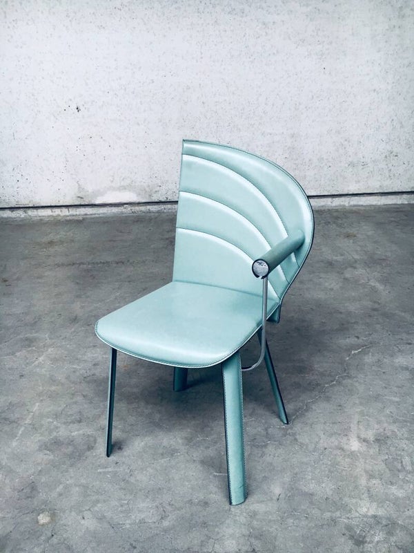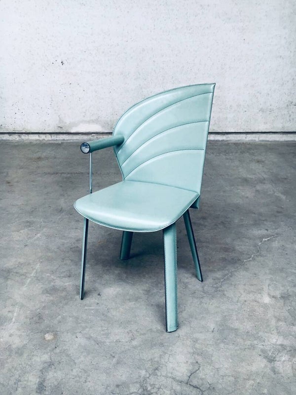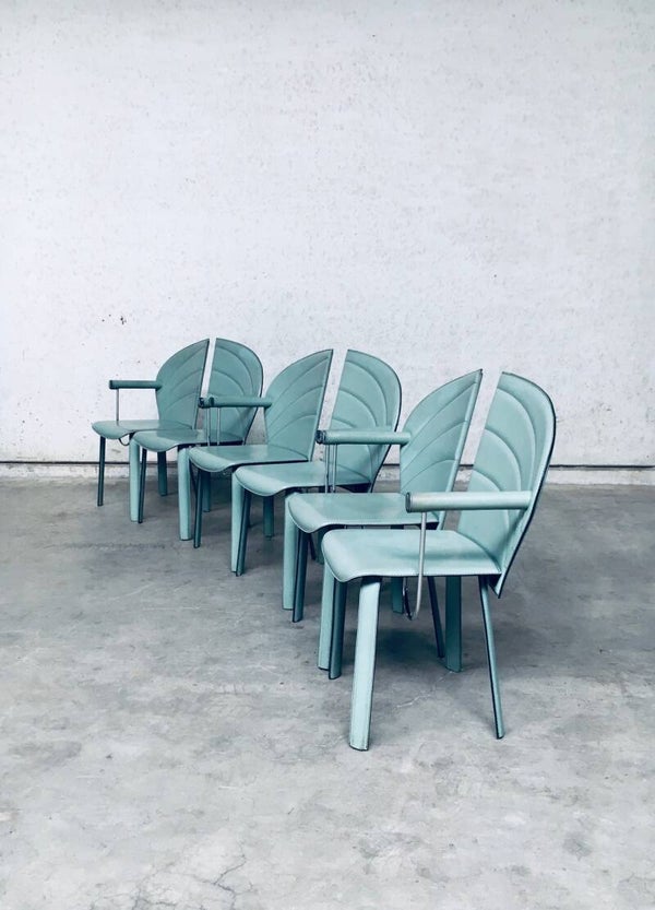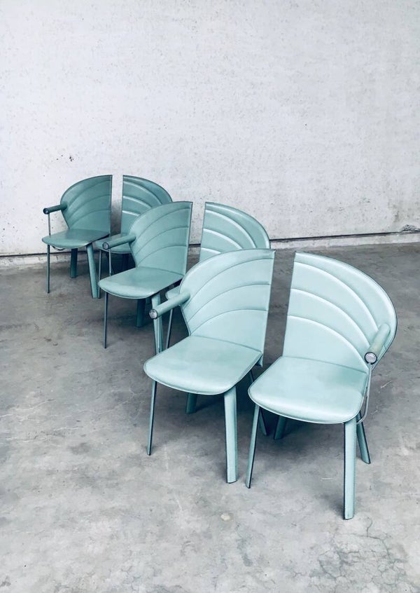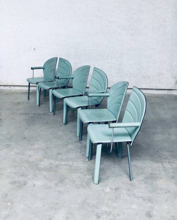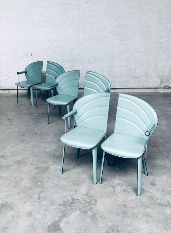 Vintage Postmodern Italian Design Leather covered Dining Chair set of 6 by Mario Morbidelli for Naos. Made in Italy, 1980's. Petrol green color leather on metal frame. 3 chairs have a left armrest, 3 have a right armrest. You can place these together as a Couples double chair. Chairs are in overall good condition, with no damage, other than scuffs, wear marks and slight staining in the leather from being used. Wear marks such as darker or lighter stains. On the armrests, there's some dents in the front end chrome part, and on some chairs the leather has come slightly loose on the seem. These are hard to find, special in design, dining chairs. In typical Postmodern style. Each chair measures 91,5cm x 48cm x 51cm.