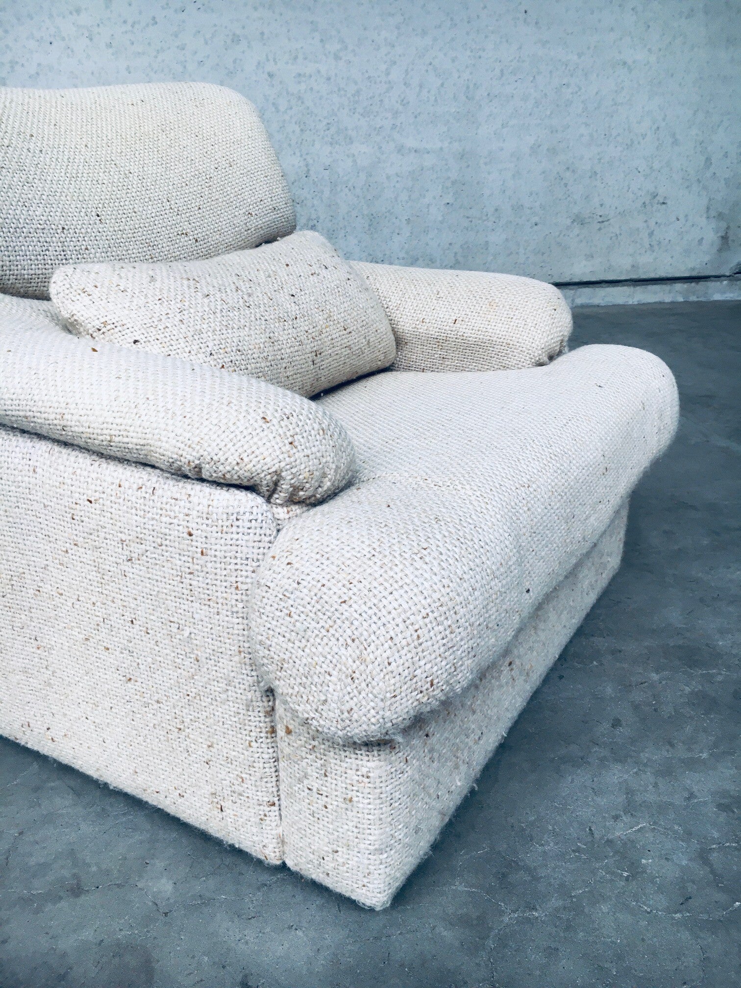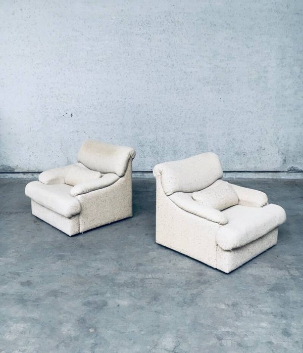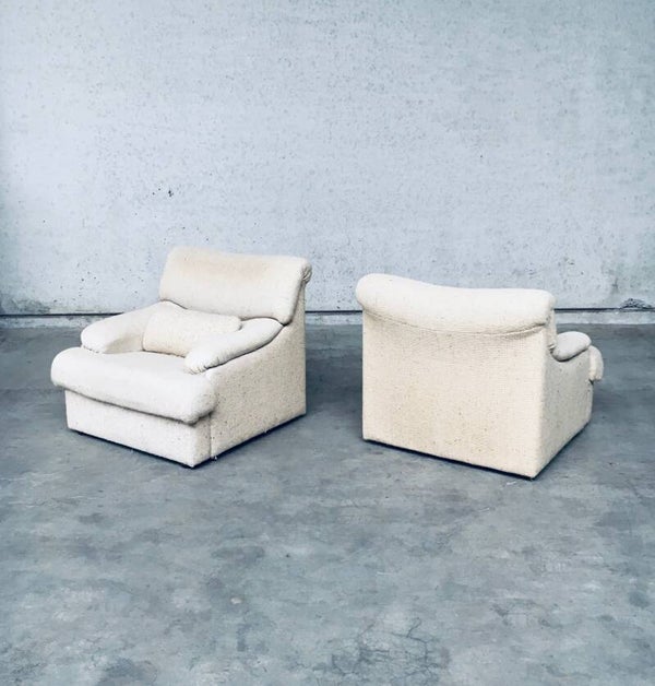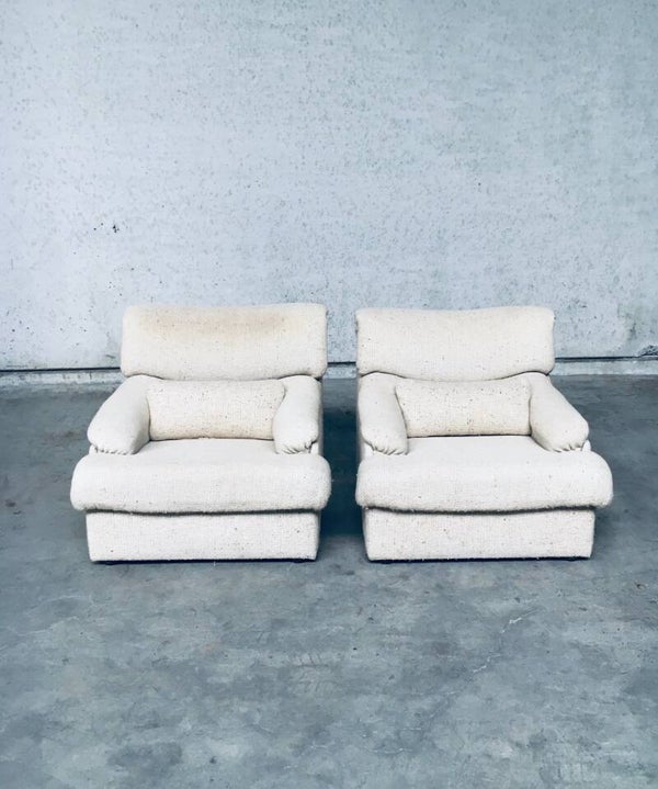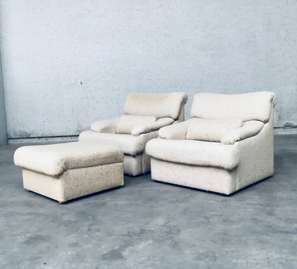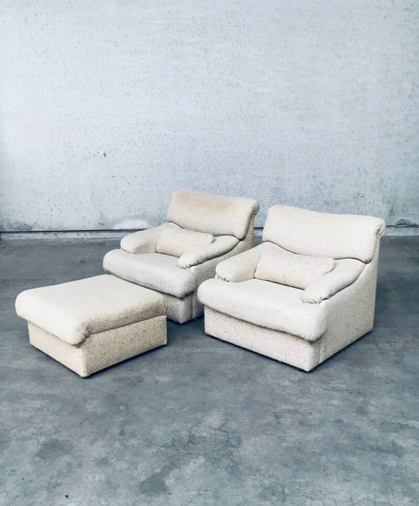 Vintage Midcentury Modern Design Boucle Woven Wool Lounge Chair & Ottoman set. Made in Italy in the 1970's. Set of 2 lounge chairs and 1 ottoman. All covered in woven boucle wool. All original arm chairs and ottoman pouf. The original woolen fabric is in good condition, on one chair it has some more discoloration on the head rest part from it's usa and age. Both chairs have their original loose extra back support cushion. Overall both are in very good vintage condition. Each chair measures 80cm x 92cm x 90cm - Ottoman measures 38cm x 68cm x 70cm.